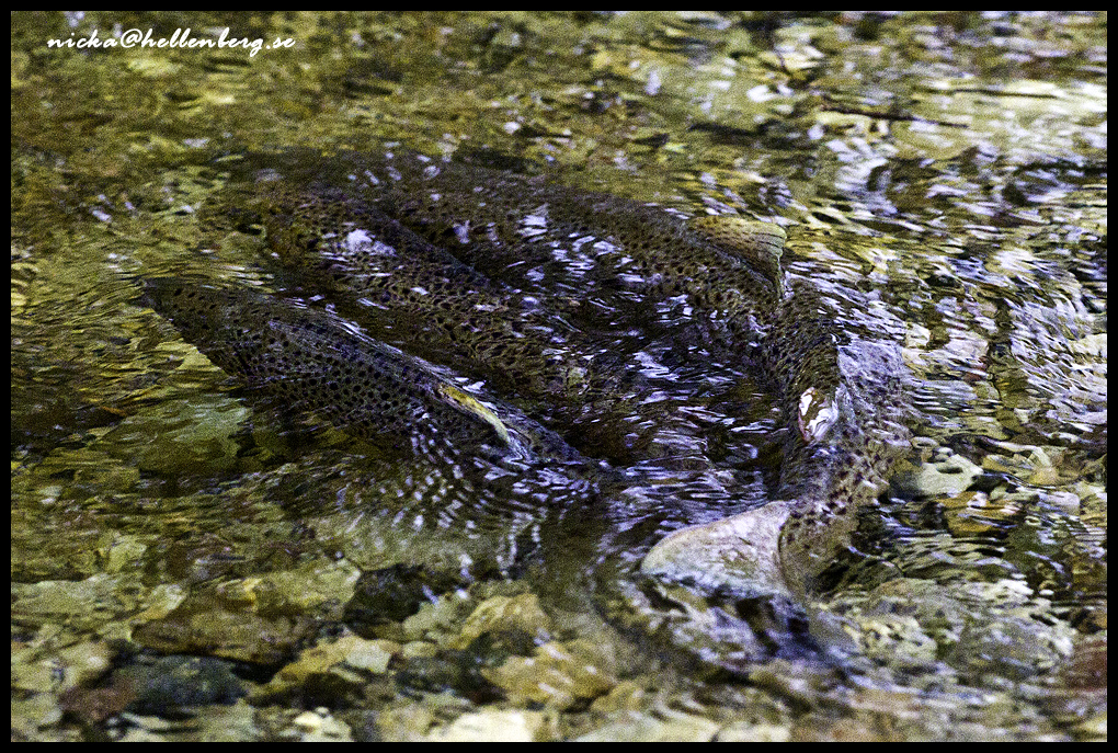 Smidighet. Styrka. Snabbhet. Målmedvetenhet. Jag vrider nacken i samma tempo som om jag bevittnar en högintensiv tennismatch. De kan dyka upp var som helst och det gäller att snabbt slänga upp kameran och hitta fokus om man ska få dem på bild. Men vilka fantastiska varelser de är, Salmo trutta. Det smärtar när jag tänker på de människor som berövar fiskarna deras chanser att få leka. Lekfisk ska inte dödas i nät (eller med krok, för den delen).