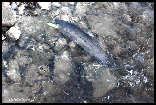 Så biter det. Mobiltelefonen ligger i ett vattentätt skal, som gör fotona synnerligen usla och mjölkiga, men det får bli en sån. Öringen simmar snart åter. Jag drar mig tillbaka.